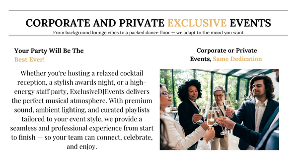 Whether you're planning a birthday bash, company party, fundraiser, or any special event — we’re here to make it amazing. At ExclusiveDJEvents, we do more than just play music. We keep your timeline on track, make every announcement with confidence, and bring your guests together for a stress-free, high-energy celebration.